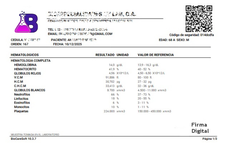 Su Laboratorio Clínico cuenta con el sistema Biocare desde hace 1 año, nos ha facilitado el reporte de resultados, así como los datos estadísticos de pacientes y cada prueba, es de fácil manejo y se puede adaptar a los cambios que ha requerido el reporte de cada examen. Los pacientes quedan satisfechos al recibir los resultados de forma digital, brindandoles mayor comodidad, a los médicos les ha permitido abordar de forma inmediata la Clínica del paciente. Biocare es una opción viable para cualquier laboratorio, lo recomiendo ampliamente.